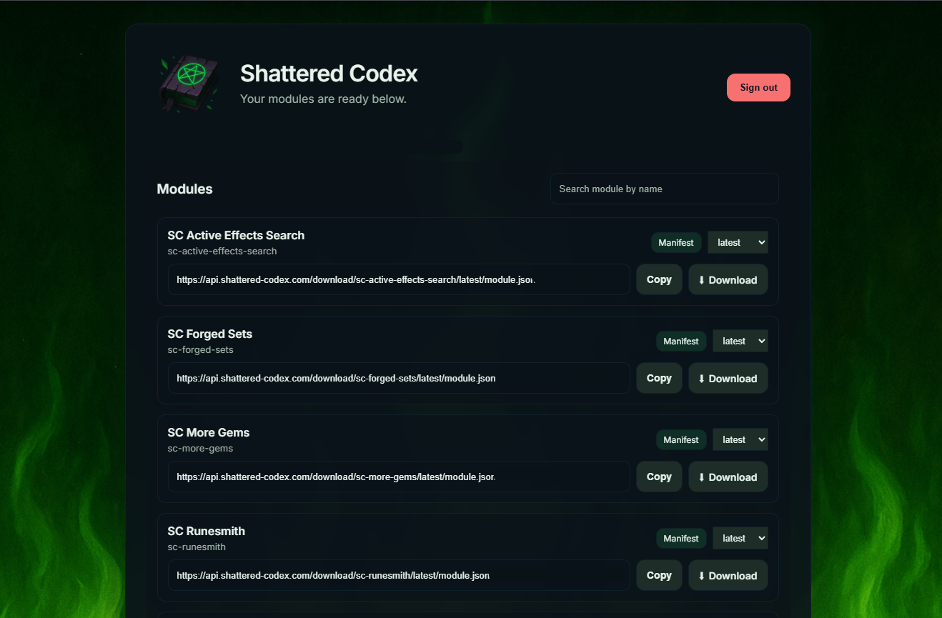 Open the Shattered Codex Download Hub and copy the manifest for the premium module you want to install.