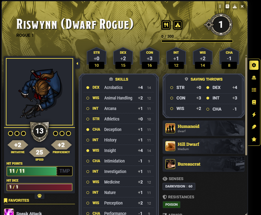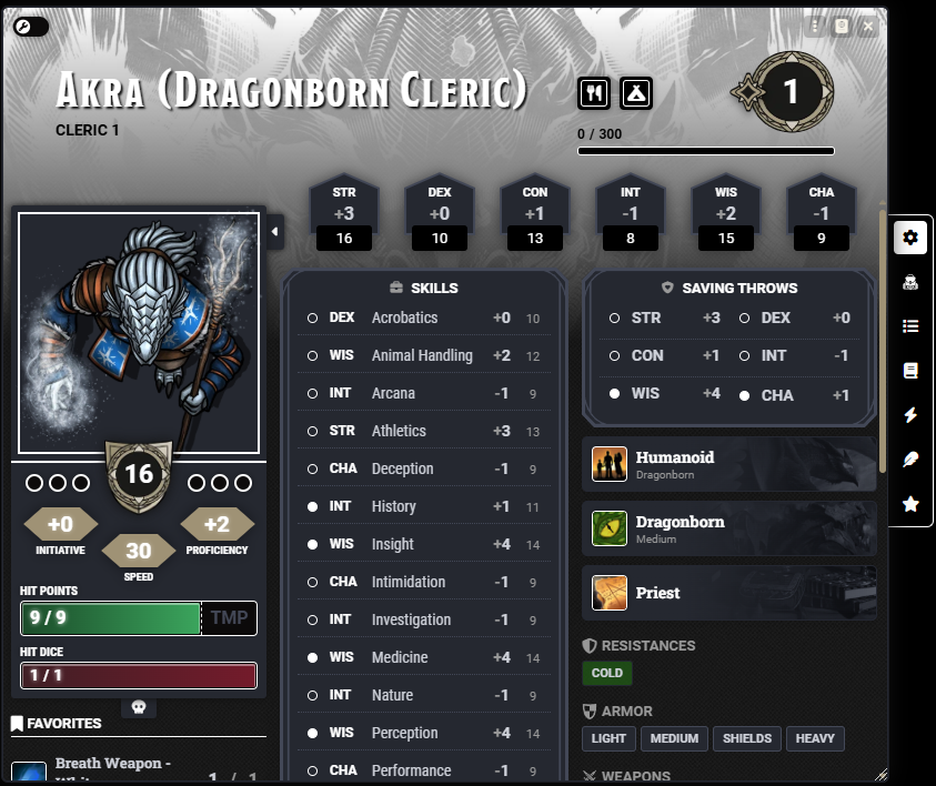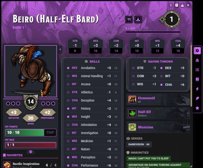A configured class profile can tint the header, accent color, tables, and labels so the sheet feels class-specific instead of generic.
