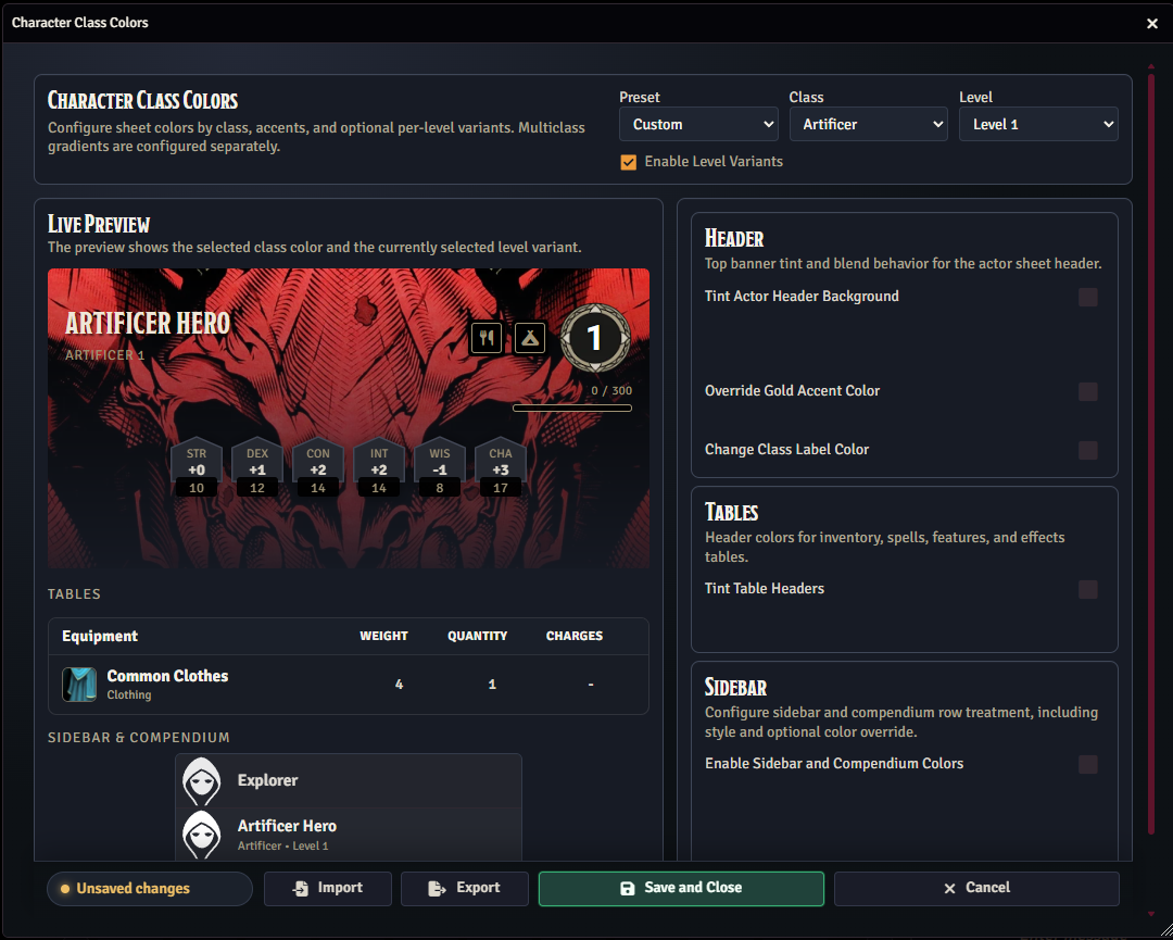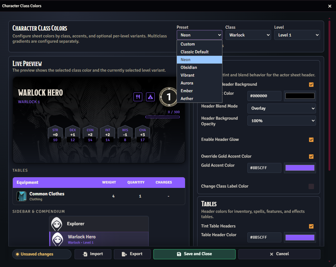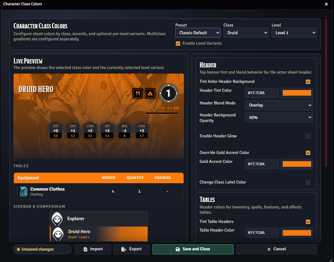- Use the module launchers to configure character colors, multiclass gradients, and NPC colors.