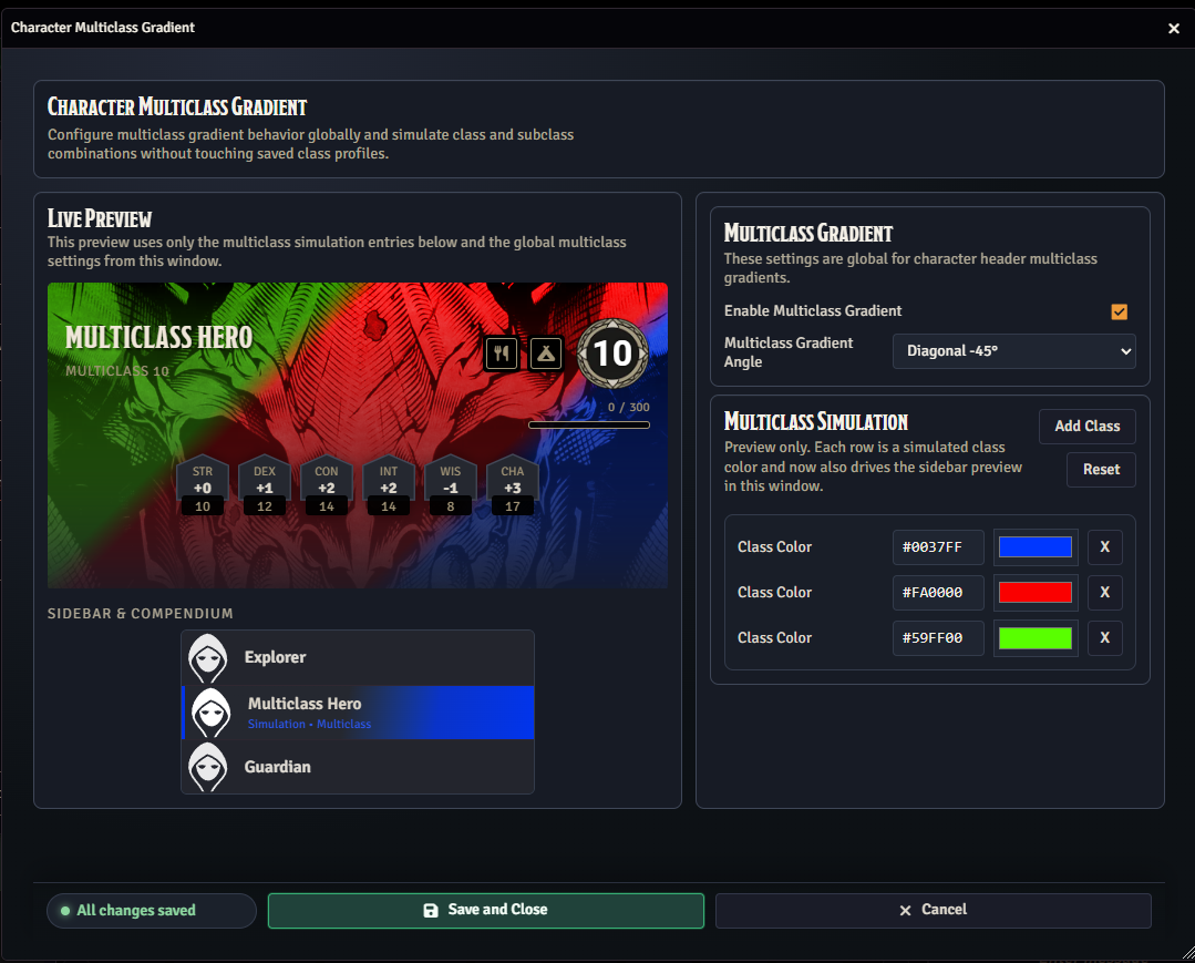 The multiclass editor is global, and its simulation preview lets you test blended class colors without rewriting your saved class profiles.