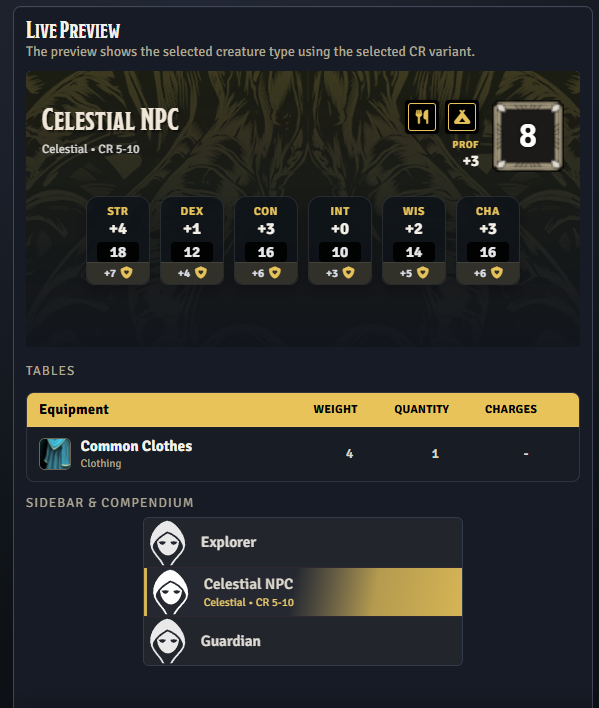 NPC profiles use the same live-preview workflow, but the top bar switches creature type and CR tier instead of class and level.